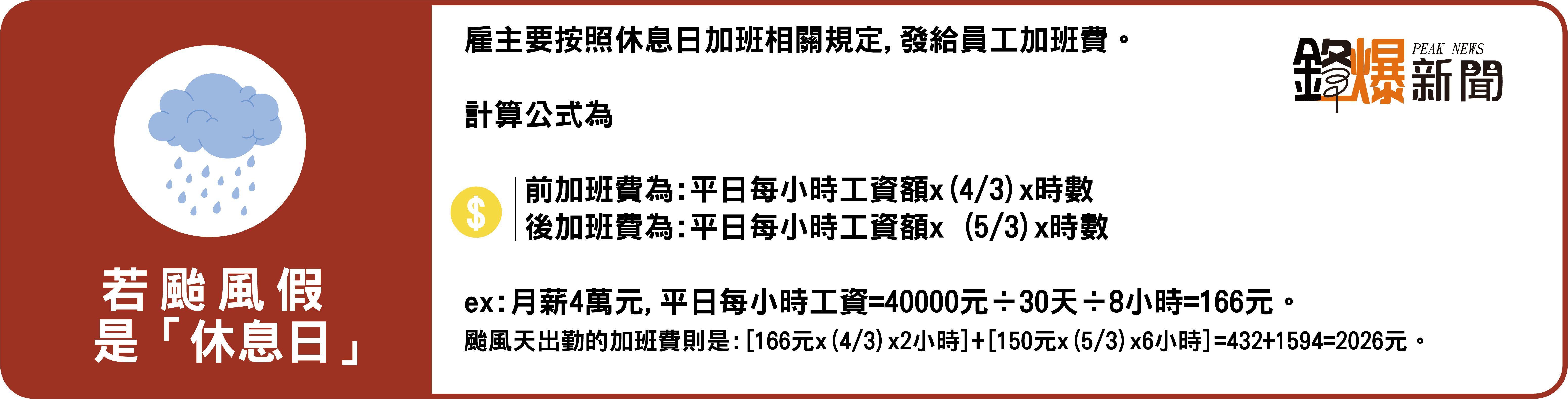 同時,勞工若因安全考量選擇不出勤,雇主不得以此懲處、記曠職、扣除全勤獎金或影響績效評比。惟由於勞工未提供勞務,雇主得依法不支付當日薪資。勞動部強調,「颱風假不是假」,而是因不可抗力導致工作中斷的安全性措施。呼籲各事業單位與勞工在颱風期間以人身安全為最優先,共同落實防災應變,確保勞動權益與公共安全兼顧。