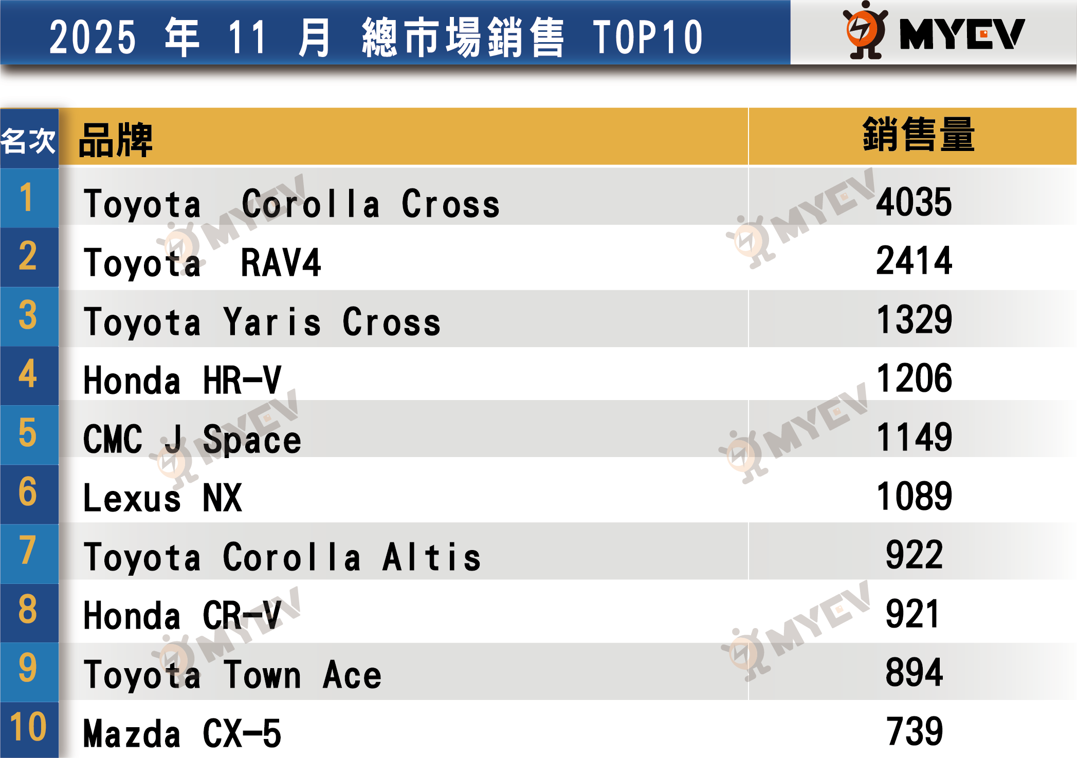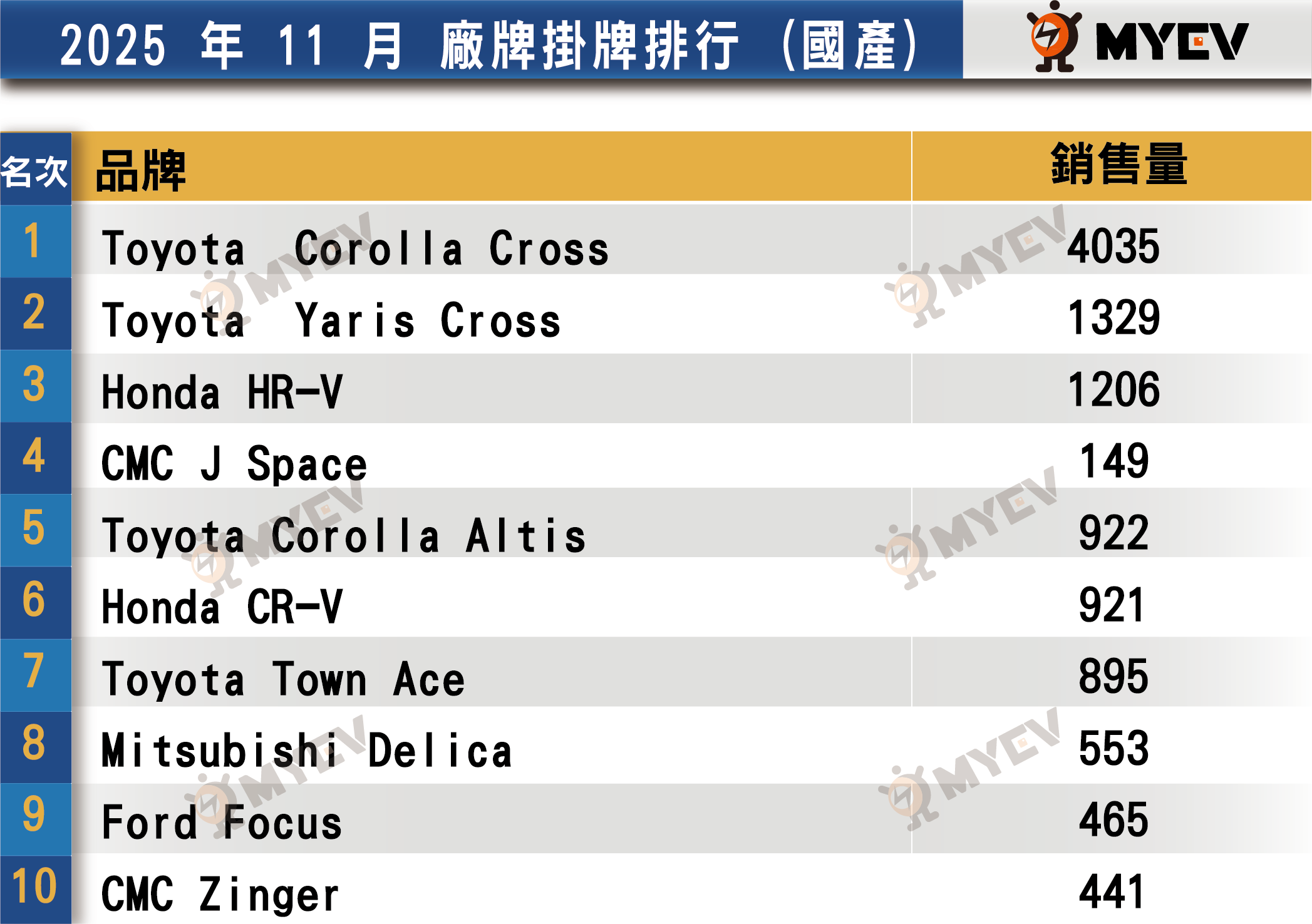 國產車市場方面,Toyota持續領先,Corolla Cross 11月份掛牌4,035輛,較10月成長;Yaris Cross與Honda HR-V、CMC J Space則略微衰退。Honda CR-V單月掛牌921輛,表現穩定。福特六和Focus在國產市場維持第9名,領牌465輛。新車Territory於11月份先行領牌24輛作試乘用途,12月2日將正式發表。