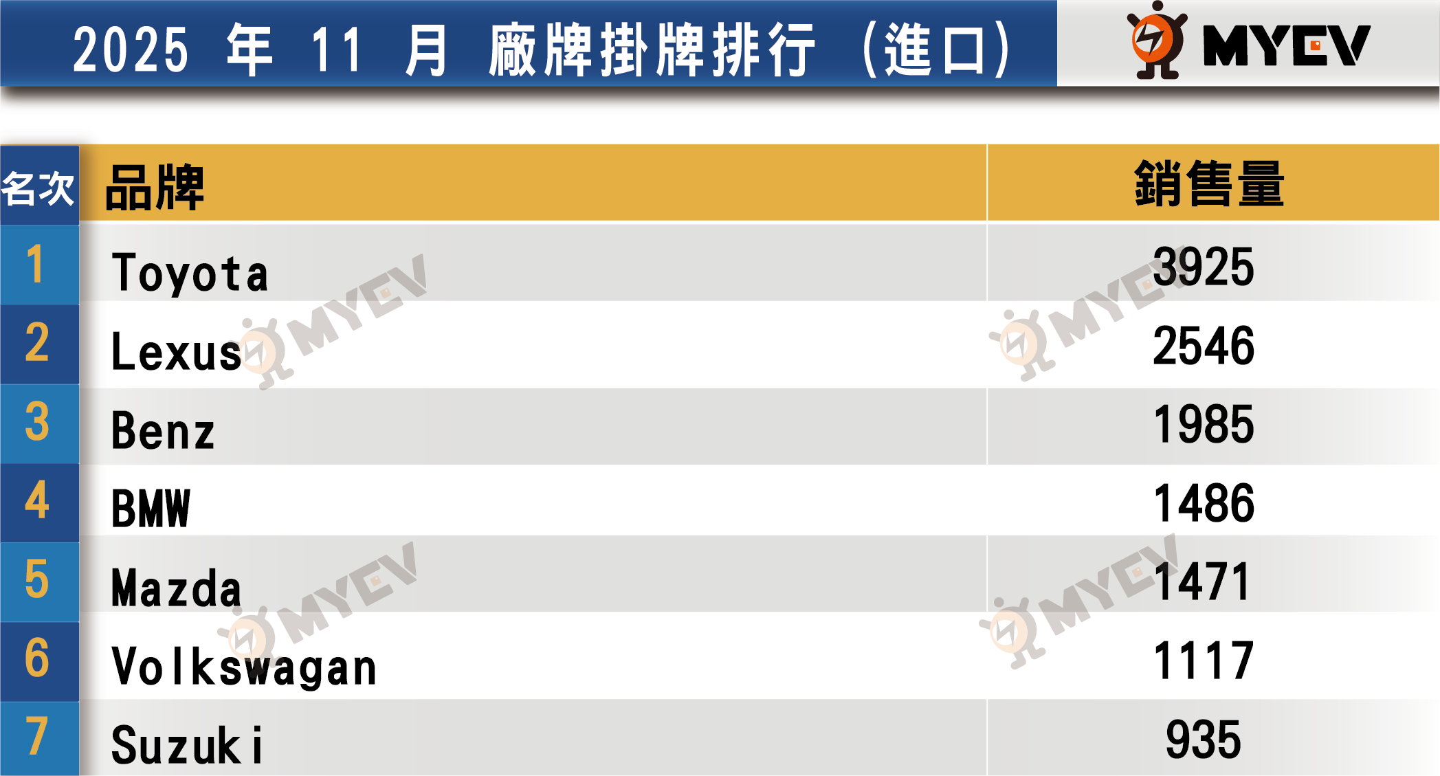 一般進口轎車方面,Toyota Camry 11月掛牌463輛,Suzuki Swift 336輛,Volkswagen Golf 224輛。休旅車市場,RAV4單月掛牌2,415輛,較10月成長61.9%,Mazda CX-5掛牌739輛,銷售增幅達一倍。