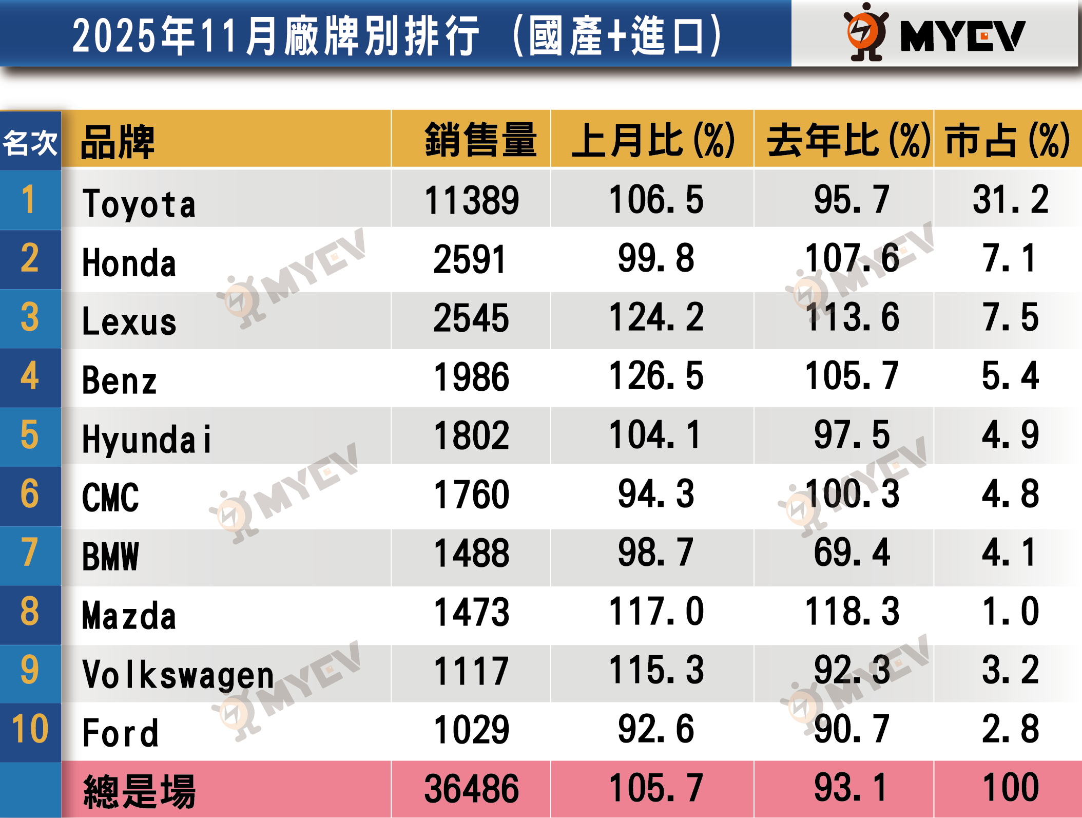 11月份進口車總市場掛牌18,124輛,月增18%,但較去年同期衰退約5.8%。Toyota以RAV4及Camry等主力車款領牌3,925輛,月增45.6%,累積銷售仍居冠。Lexus累積至11月銷售26,824輛,較2024年同期微幅提升0.9%,Kia亦有2.8%成長。