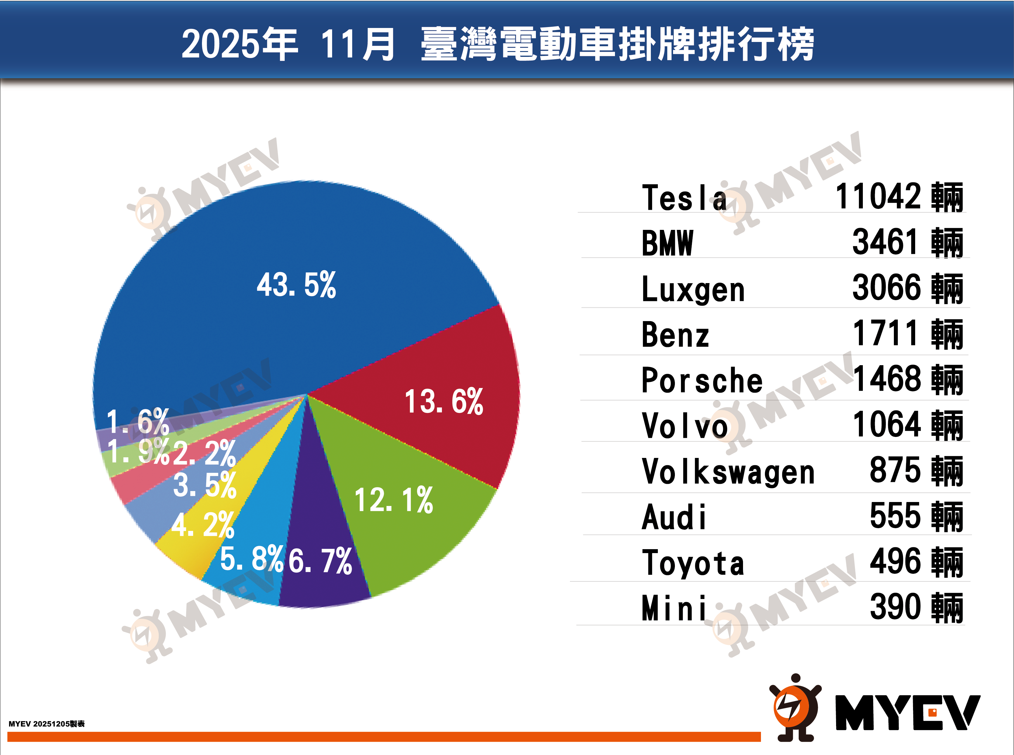 11月份電動車總市場掛牌1,966輛,較10月回升。Tesla主要掛牌462輛Model 3,合計單月532輛;德製Model Y因船期延遲未抵臺,預計12月將有千輛車源抵臺。Toyota bZ4X小改款以128萬售價上市,單月掛牌207輛,接單達1,500張,顯示消費者對中小型純電休旅仍有高度興趣。
