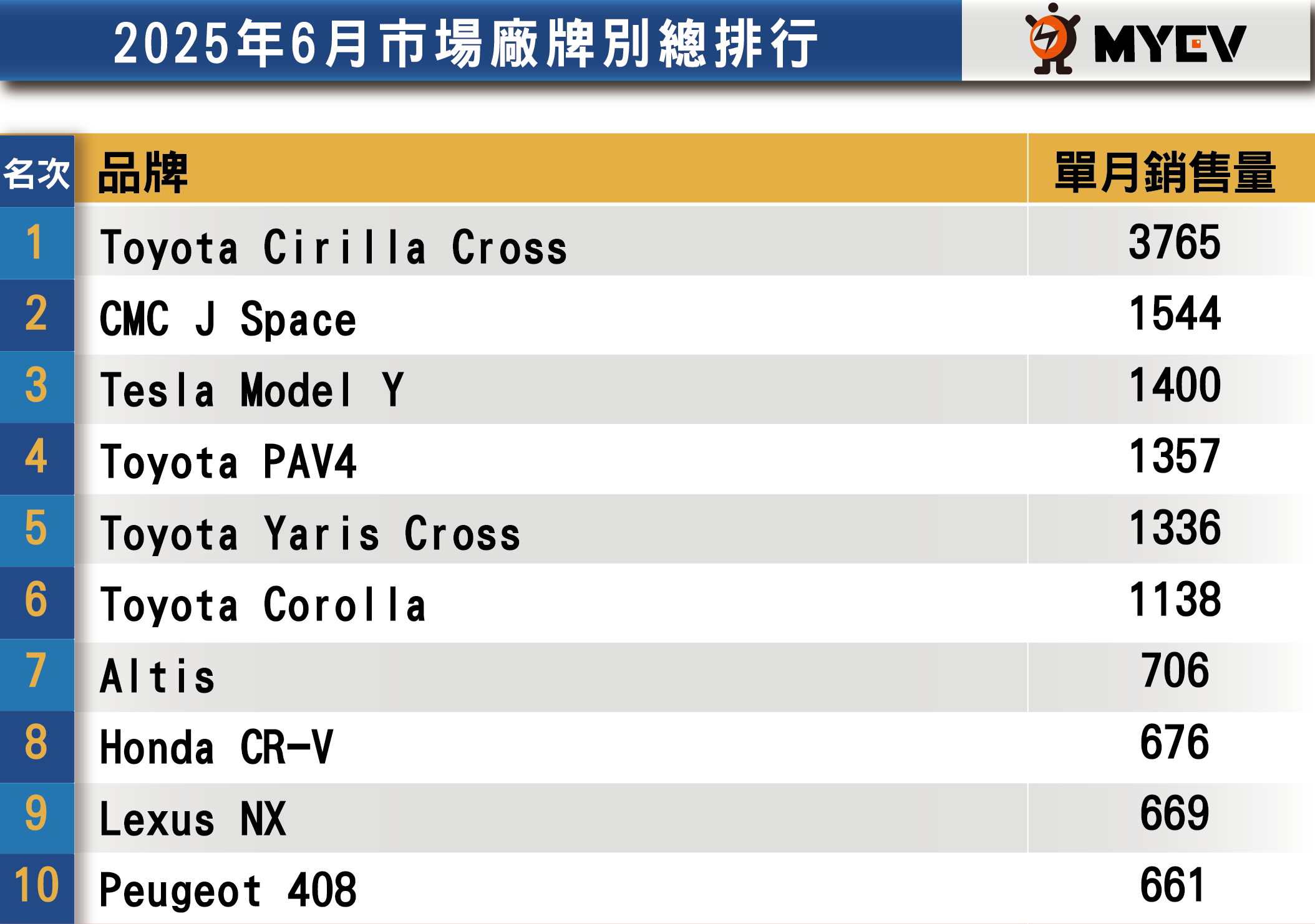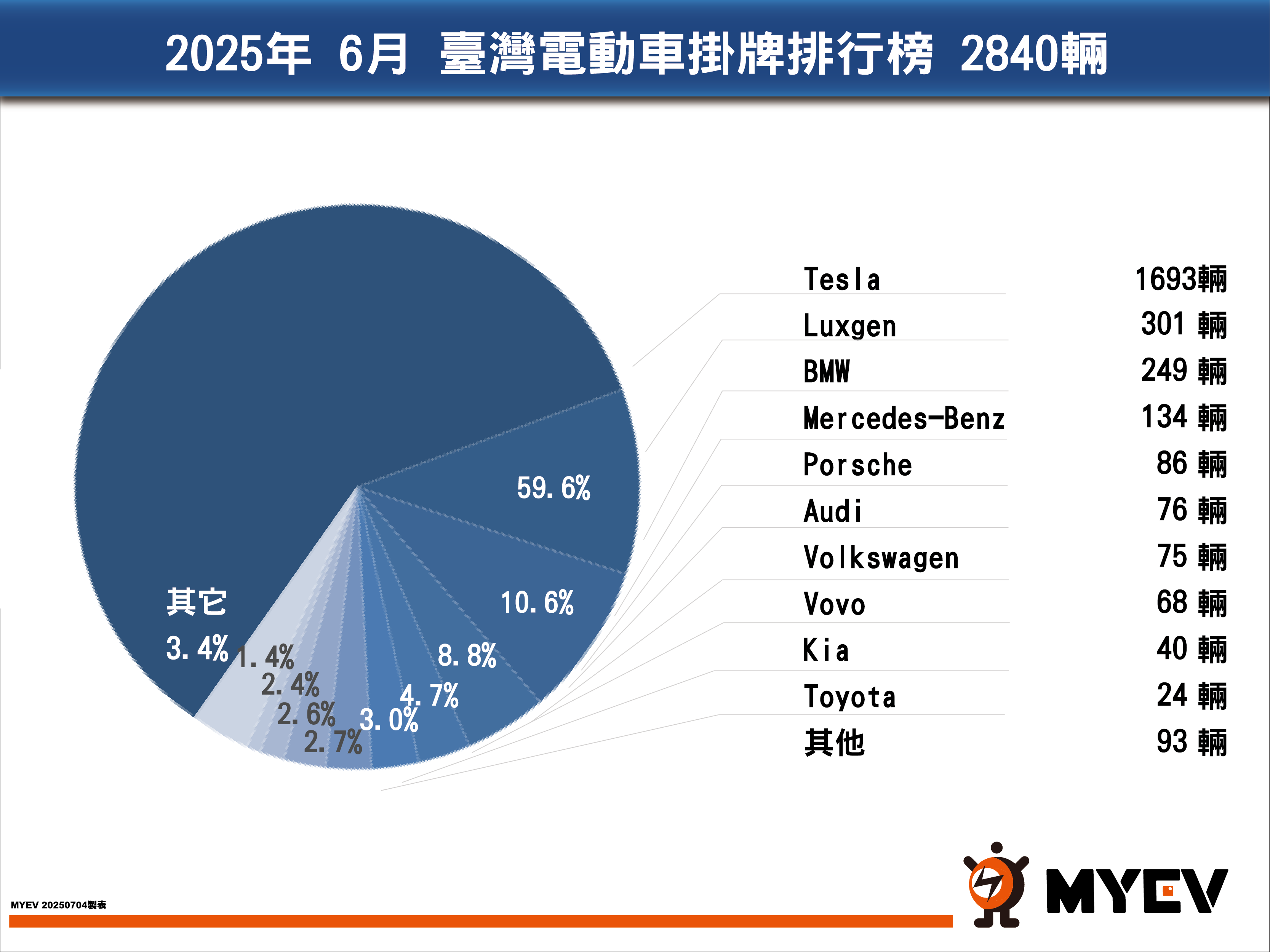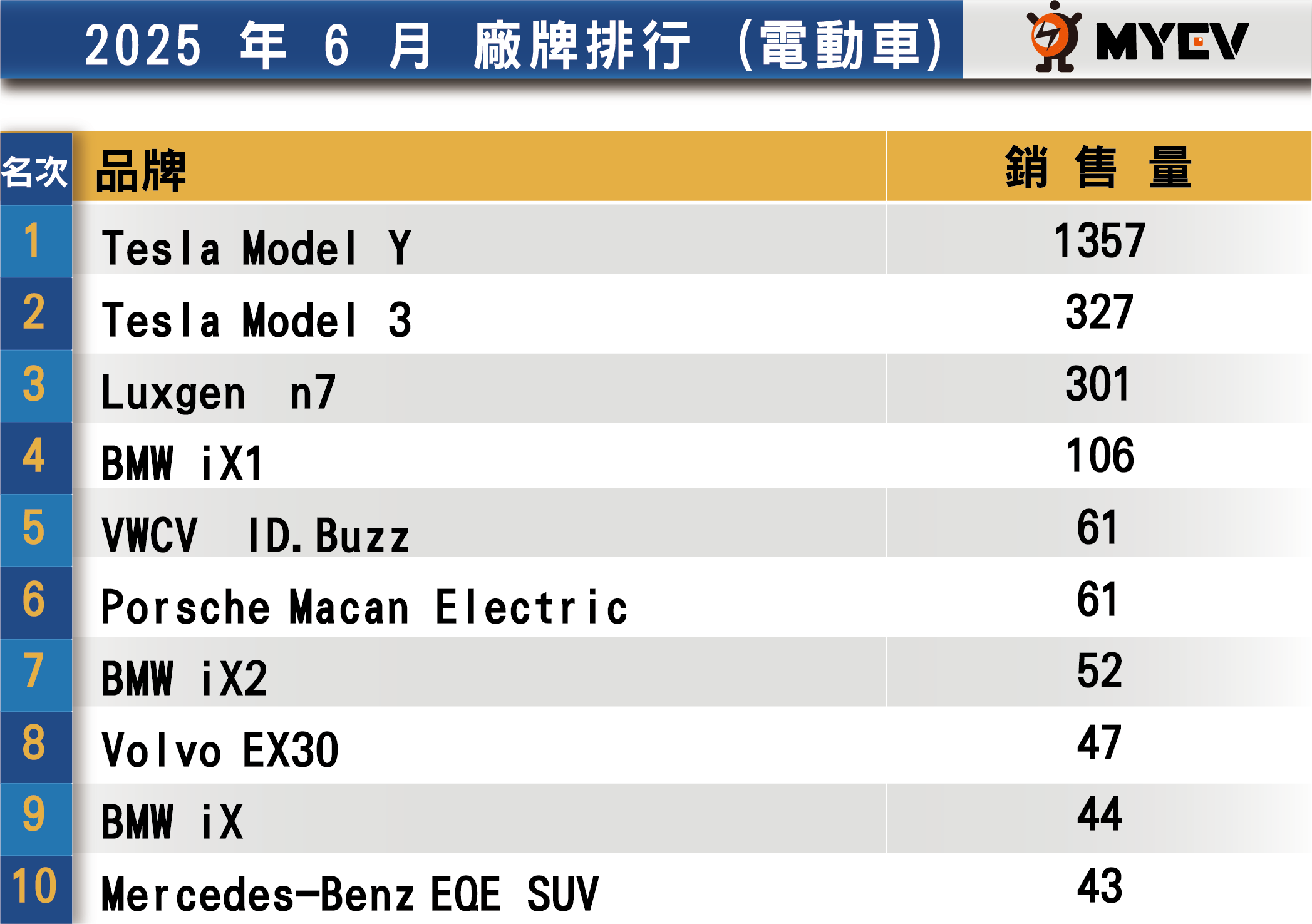 進口車方面,6月登錄數達1萬6646輛,月增2.6%,但年減幅達22.6%,市占率亦跌破五成至48.5%。其中,美系電動車品牌特斯拉以1693輛成績突圍,榮登進口車排行榜第4名,更在高級車市場中搶下第3名的位置。