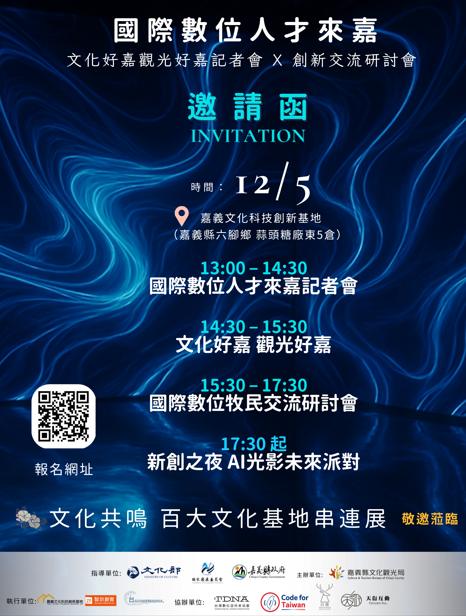 活動將從國際交流記者會揭開序幕,跨國團隊將分享全球工作趨勢、創新協作方式與在地文化連結的經驗,強化嘉義與國際數位人才社群之間的互動。隨後登場的文化與觀光展示,以嘉義百大文化基地為主要內容,透過科技與文化結合的呈現方式,展現地方文化資產與旅遊內容的跨域創意,呈現嘉義文化科技發展的全新面貌。