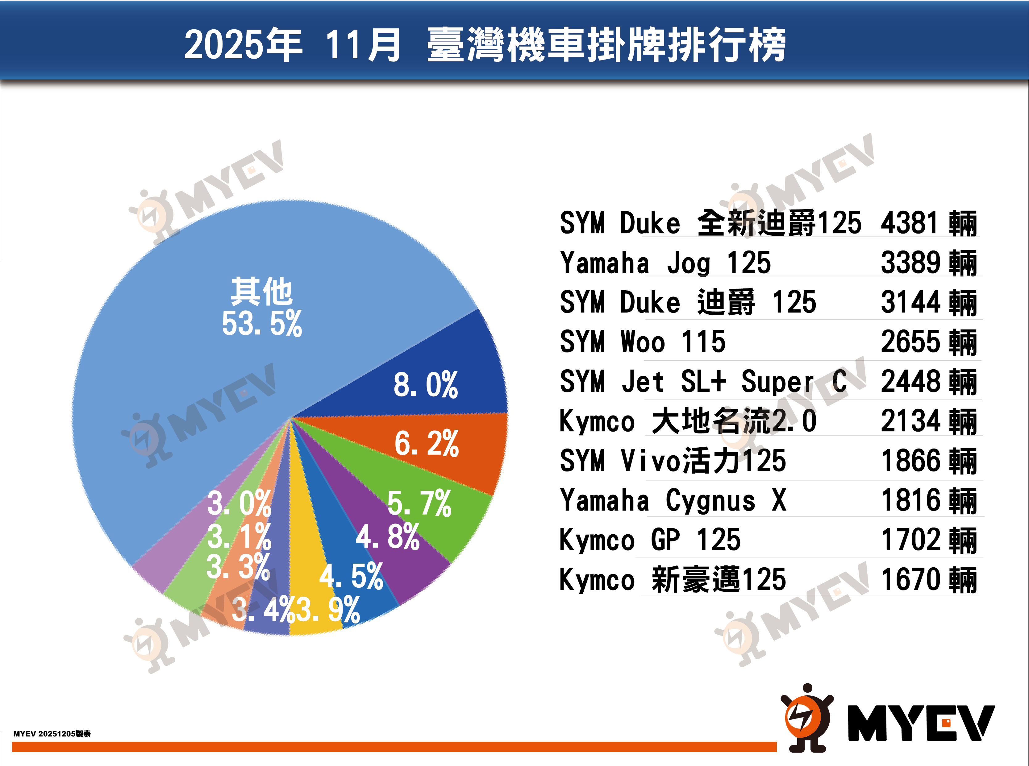 隨著進入2025年尾聲,在歷經暑期購車旺季後,11月份臺灣機車總市場掛牌數降至54,311輛,較10月衰退16.1%,較去年同期衰退10.5%,為今年度第三低(僅高於1月與4月)。雖然市場整體熱度下降,但仍有部分品牌與車款表現亮眼,尤其是Suzuki與Honda為Top 10品牌中少數銷量正成長者。