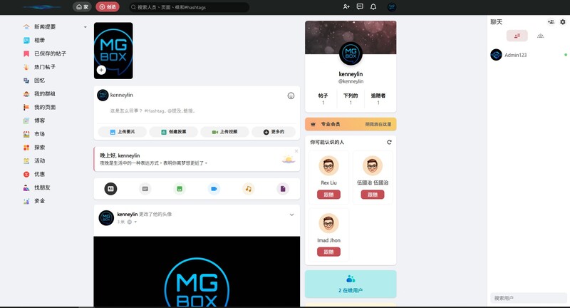 從實際操作介面觀察,平台採用類似主流社群網站的動態牆設計,包含貼文發布、圖片與影音上傳、投票功能等模組,降低用戶學習門檻。同時,左側整合「社團」、「相簿」、「活動」與「市場」等功能分類,右側則配置推薦好友、線上用戶與即時互動區塊,整體架構兼顧社交與商務應用場景。
